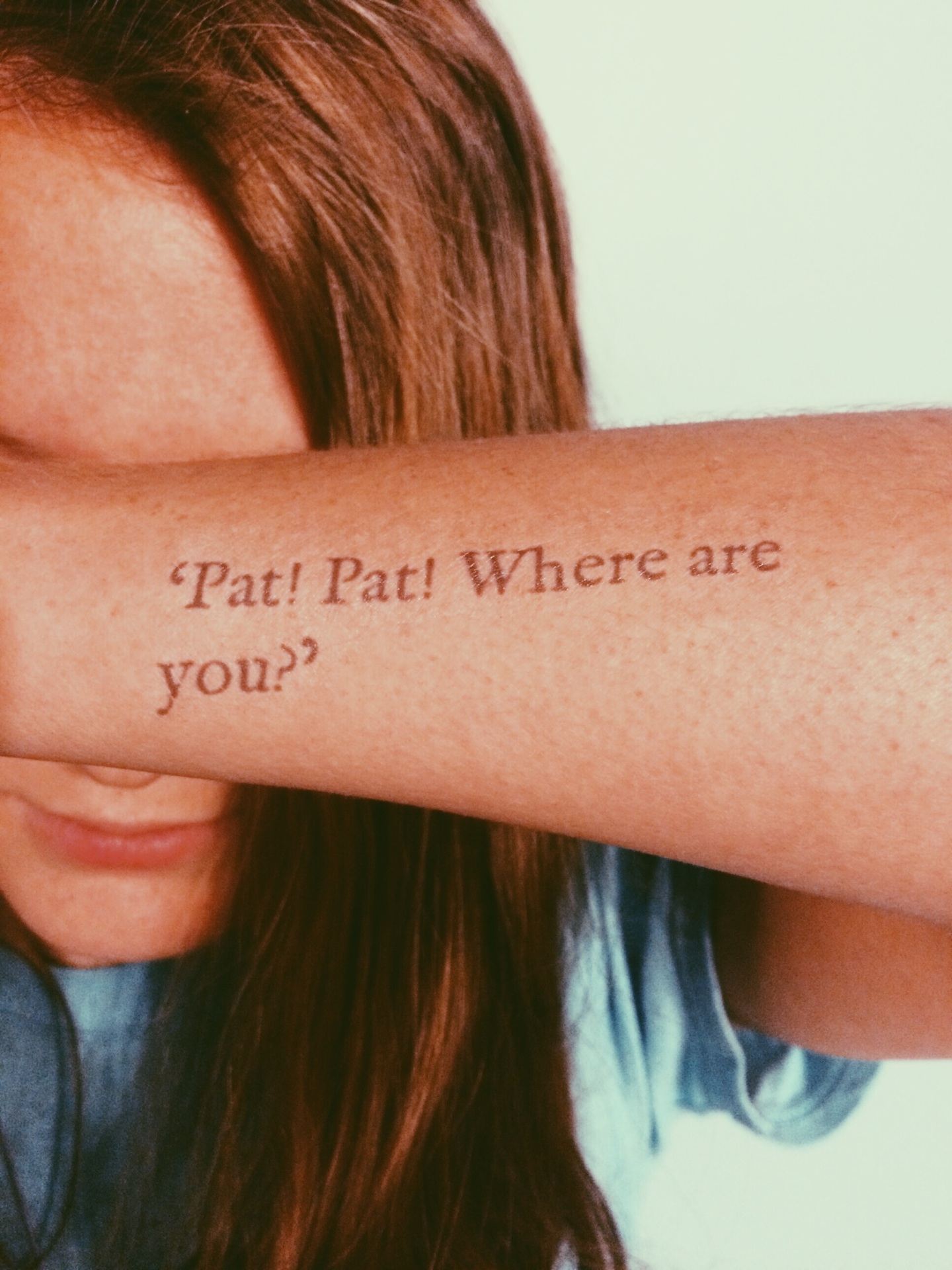 Inspired by Shelley Jackson’s SKIN Project, we’ve broken Lewis Carroll’s beloved tales, Alice’s Adventures in Wonderland and Through the Looking Glass into 5,258 unique phrases. Each of the first 5,258 backers from our Kickstarter campaign has received a randomly-selected, unique piece of the chain. Photos are now being uploaded to our tattoo app, where we’ll “print” the story in full.
